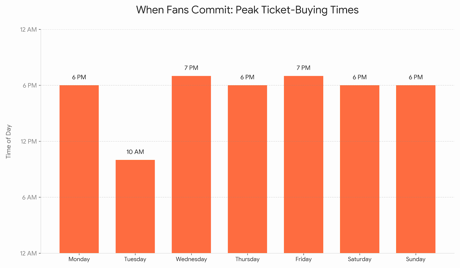 The pattern is surprisingly consistent: most ticket buying happens between 6:00 PM and 7:00 PM almost every day of the week. That’s when work is done, routines loosen, and people start thinking about how they want to spend their time. Buying a ticket isn’t a task; it’s a decision about a night out. For most of the week, that decision happens in the evening.